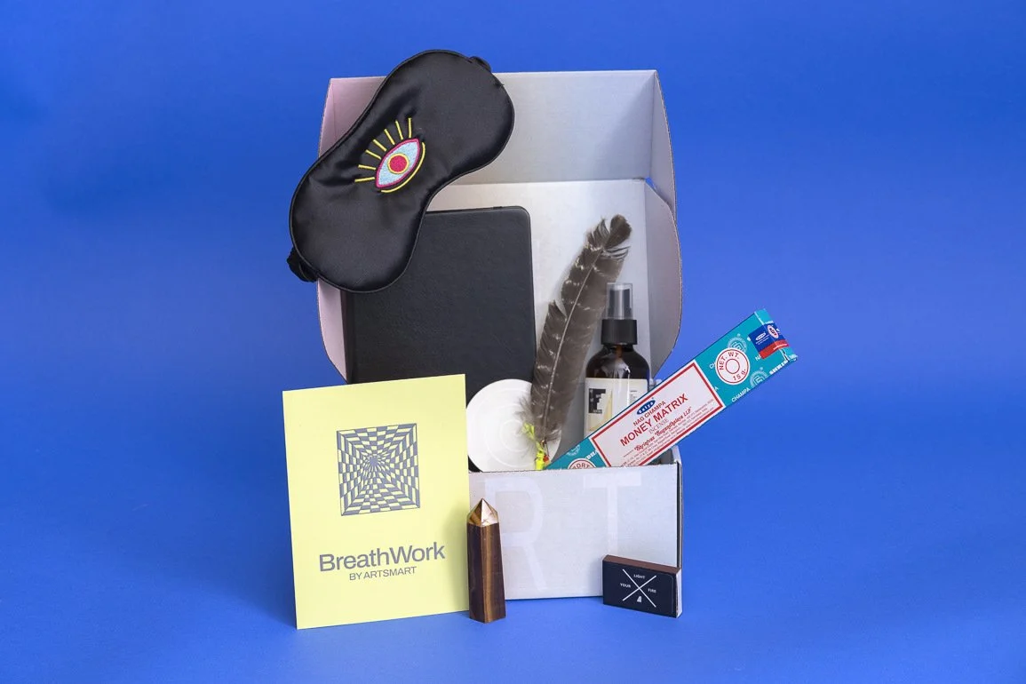 ArtSmart’s Money Healing Kit contains all the tools to help your practice: Money Matrix Incense, “third eye” eye mask, Money Healing room spray, a custom journal, pyrite and tiger’s eye stones, and an adorned turkey feather, which pairs perfectly with the ArtSmart Money Healing Meditation. Each piece of the kit aids you in calling forth the elements in order to transcend into a space where you can embrace your unique financial journey to Money Healing.